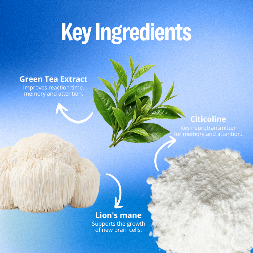 Lions Mane, Cicoline, Green Tea Extract, Sugar, Corn Syrup, Water, Pectin, Citric Acid, Sodium Citrate, Malic Acid, MCT Oil, Natural Flavors and Colors, Hemp Extract.